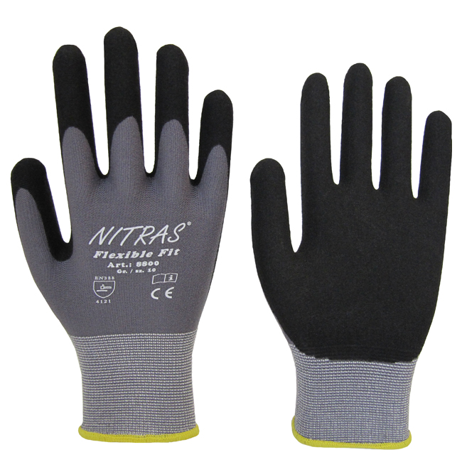 Nahtloser Strickhandschuh mit speziellem Strecht-Gewebe, grau, schwarze Beschichtung auf Innnenhand und Fingerkuppen aus Nitril/PU-Gemisch, exzellente Paßform, guter Nass- und Trockengriff.