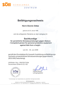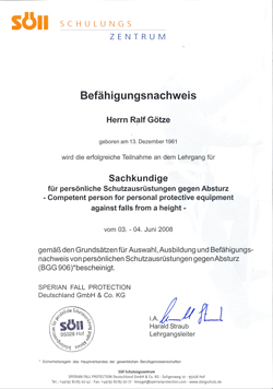 Die Prüfung wird nach den vom Hersteller vorgegebenen Richtlinien und Unterweisungen sowie den Regeln für den Einsatz von persönlichen Schutzausrüstungen gegen Absturz Z H 1/70 9 und den entsprechenden Vorschriften der UVV durchgeführt.