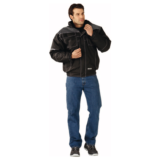 2 Brusttaschen mit Patte und Klettverschluss, Kontrastnähte, Frontpatte mit Druckknöpfen, Reißverschluss am Kinn hinterlegt, elastische Ärmelbündchen mit Klettverschluss verstellbar, Gummizug im Bund, 1 Innentasche links, einrollbare Kapuze im Kragen, Reflexapplikationen an den Ärmeln.