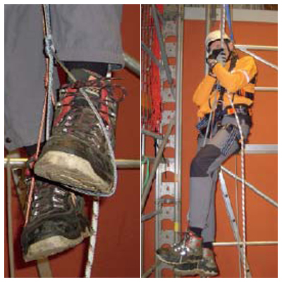 Die Prusukschlinge (auch Reepschnur genannt), wird mit dem Prusikknoten – einem lösbaren Klemmknoten – am Sicherungsseil (Verbindungsmittel) befestigt. Die Länge der Prusikschlinge ist auf die Körpergröße abzustimmen, so dass sich die Person durch Hineintreten in die Schlinge entlasten kann. |