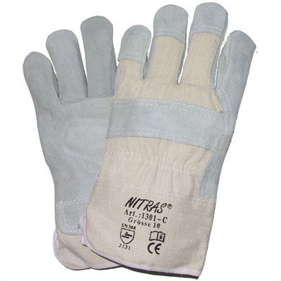 Spaltlederhandschuhe, weißer Rücken und Segeltuchstulpe, Doppelnähte, Innenhandfutter