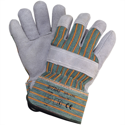 Rindspaltlederhandschuhe, 1,2 mm min., gestreifter Rücken, gummierte Stulpe, Doppelnähte, Innenhandfutter