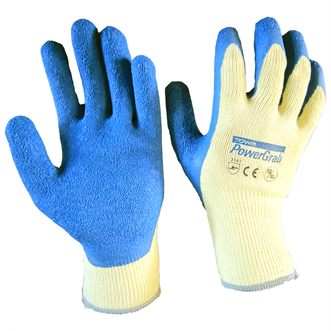 Polyester-Strickhandschuhe, blaue Latexbeschichtung, Handrücken frei, gemäß EN 388 - Kategorie 2