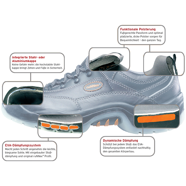 Überkappe und durchtrittsichere Stahleinlage, gepolsterte Ferse und Schaftabschluss, gepolsterte Faltlasche, Leichtlaufschnürung, reflektierende Biese und Applikationen