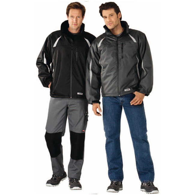Gut geschützt gegen Nässe. Atmungsaktiv, wasserdicht, 2 eingesetzte Seitentaschen mit wasserdichtem Reißverschluss, 1 Brusttasche mit wasserdichtem Reißverschluss, wasserdichter Frontreißverschluss, Bundweitenverstellung mit Kordelzug, elastische Ärmelbündchen mit Klettverschluss verstellbar, Reißverschluss am Kinn hinterlegt, abnehmbare Kapuze, Reflexapplikationen im Front-, Ärmel- und Rückenbereich, Handytasche innen, Dokumententasche innen.