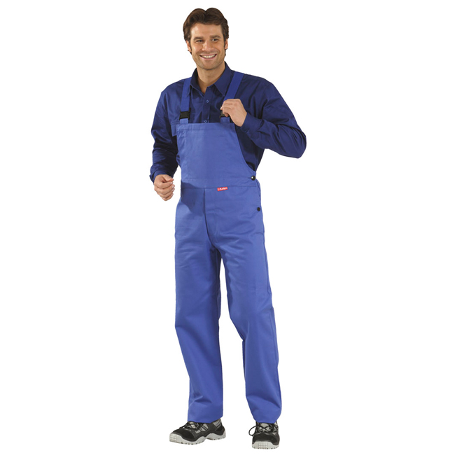 2 seitliche Eingrifftaschen, Eingriffe direkt in der Seitennaht, 1 Tasche auf dem rechten Bein mit Eingriff von hinten, innen liegende Latztasche mit Patte, 2 vollelastische Träger mit Steckverschlüssen, Latzhose auf der linken Seite am Bund durch 2 Knöpfe zu verschließen, Hosenschlitz durch Knopfleiste verschließbar.